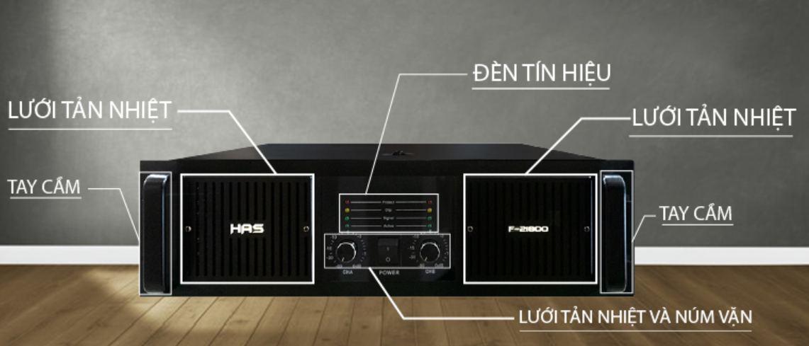 Mặt trước của Cục đẩy HAS F21800 được bố trí đầy đủ các khe và tản nhiệt cùng với các núm điều chỉnh và hệ thống đèn báo, giúp cho người dùng dễ dàng điều chỉnh và quan sát.