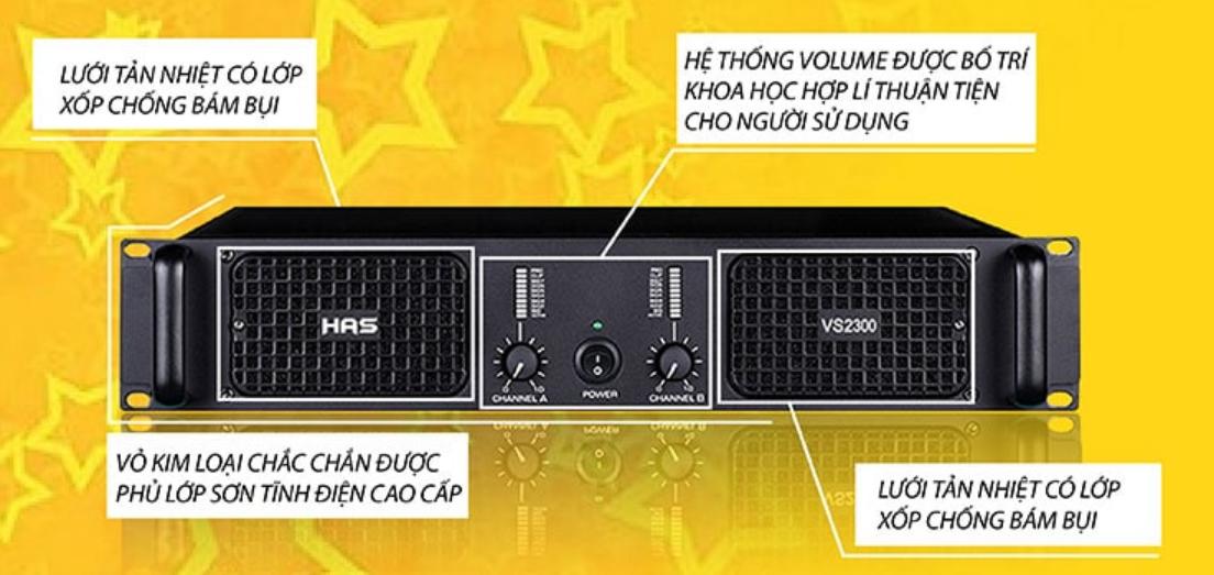 Cục đẩy HAS VS2300 sử dụng sò Sanken cao cấp từ Nhật Bản. Cung với mức công suất là 300W x 2CH (8Ohm), 450W x 2CH( 4Ohm). Mang đến những dải âm chất lượng, rõ ràng trong từng chi tiết. Giúp cho người dùng cảm nhận được những chất âm tuyệt vời. Bên cạnh đó, dòng HAS VS2300 này còn thích hợp phối ghép được với nhiều dòng loa karaoke trên thị trường.