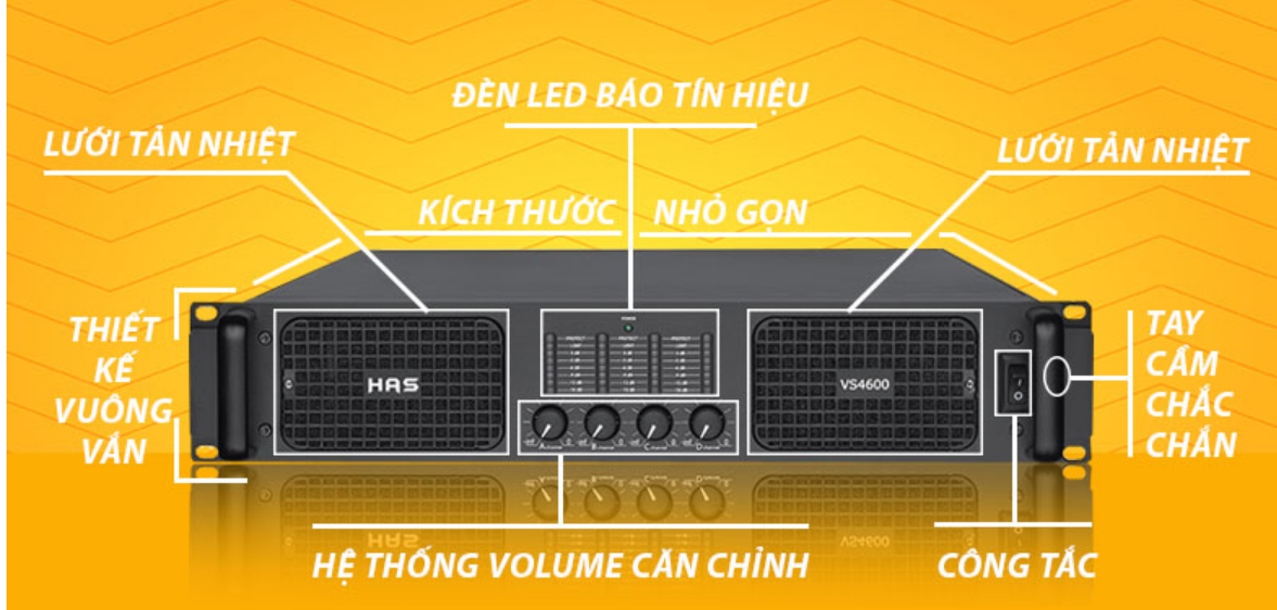 Mặt trước của Cục đẩy VS4600 được bố trí các nút điều chỉnh 2 kênh tách biệt và được sắp xếp rõ ràng. Mặt sau của cục đẩy công suất HAS là các hệ thống cổng jack kết nối tín hiệu được phân chia rõ ràng. Giúp cho người dùng kết nối dễ dàng và tránh được những vấn đề về suy giảm hay mất tín hiệu do kết nối bị lỏng hoặc tụt dây dẫn.